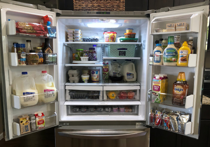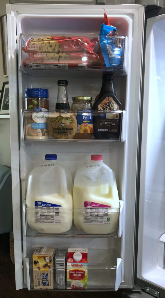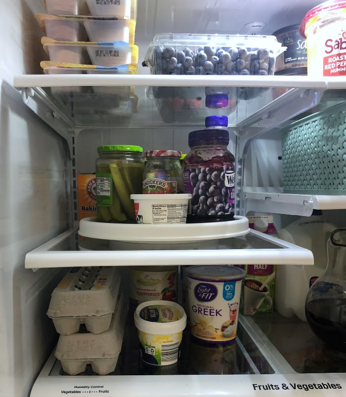 Have a specific shelf or spot for different types of items. For example, our gallon of milk we are currently using always goes in the left hand door on the second to bottom shelf. Our coffee creamers go in the right hand door on the second to bottom shelf. Jelly can always be found on the Lazy Susan and yogurt cups belong in the bottom drawer. My family knows where to find things they are looking for because they live in their zones.