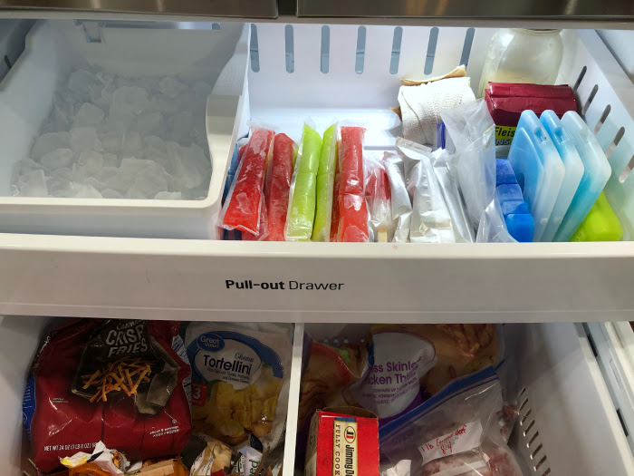 The top drawer is where our ice maker is stored. We also have flour and yeast on this shelf as well as ice packs for lunches and a bandage wrap for sore muscles. This is also the space where we keep any frozen sweet treats like popsicles or ice cream if we have it on hand.