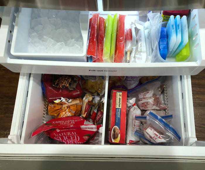 The bottom drawer has a divider down the middle. I store any frozen fruit or vegetable on the left and all meat items are stored on the right. It’s simple, but keeps the space fairly organized and I can always find what I’m looking for.