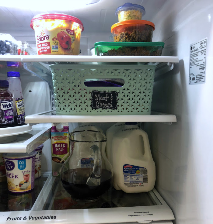 The second shelf has a basket where we store our meat and cheese products. The bottom shelf holds our extra gallons of milk (we go through about 4 gallons each week) and any tea or juice we have made to drink.