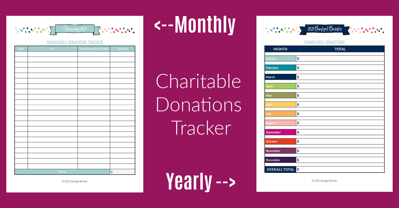 This year I’ve added two forms to help you track your charitable donations. You can use the monthly Charitable Donations tracker form in each of the monthly packets to track your donations to multiple organizations. Then total up your monthly donations at the bottom.