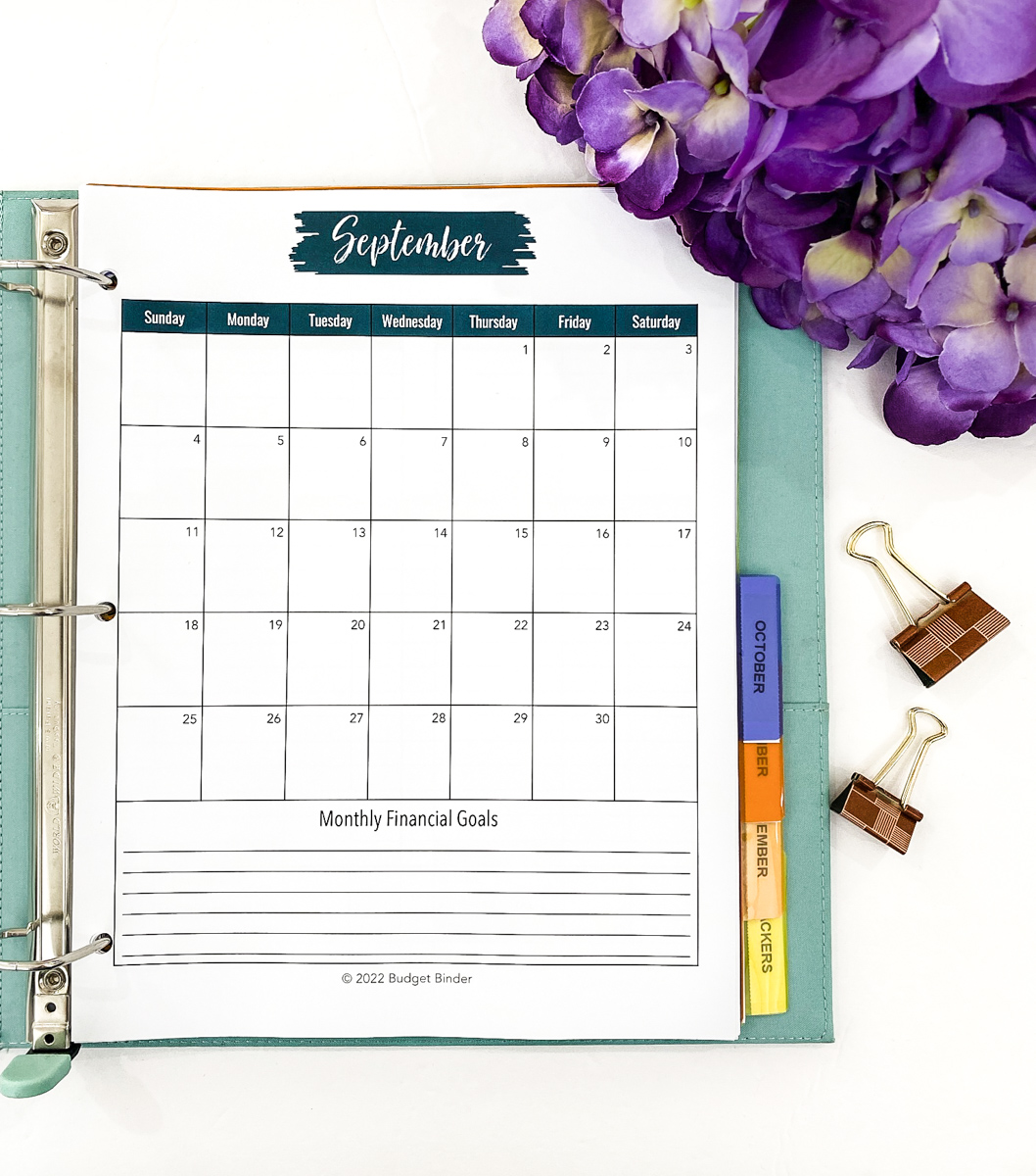 You will the option of printing a calendar to go along with your budget each month. Plus, you’ll have the opportunity to set monthly financial goals on each calendar. You can use these calendars to track monthly bills, due dates, pay days, and other monthly budget planning!