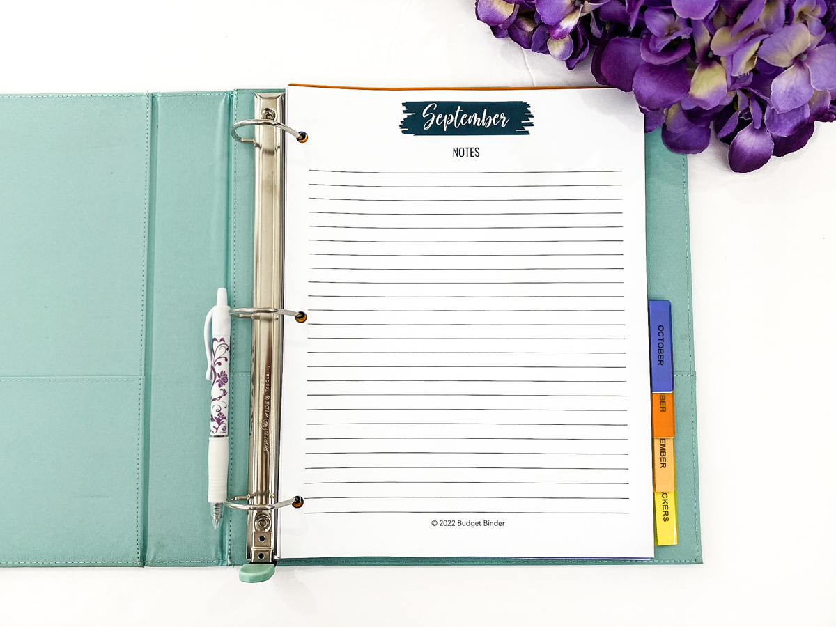 The last two forms in the monthly packs are the monthly budget goals & recap form and a blank notes page.