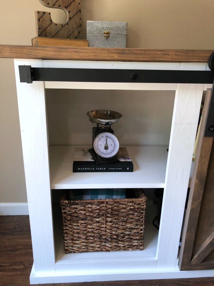 The middle is hidden behind the barn doors. This is where I store our cookbooks, crockpot, Instant pot, dutch oven, cupcake liners, and glass pitchers.